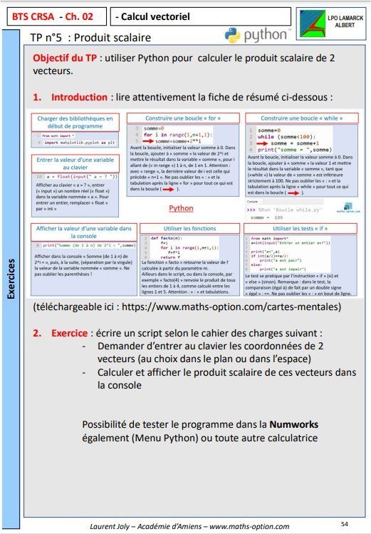 TP Python : programmation d'un algorithme présentant le calcul d'un produit scalaire à partir des coordonnées de 2 vecteurs.