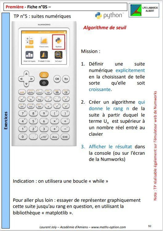 Terminer le TP Python n°5 (Suites numériques et algorithme de seuil) ; A rendre : impression papier du script et d'une vue du résultat d'exécution (console). Tout support autorisé : Edupython, Thonny, émulateur web de la Numworks...